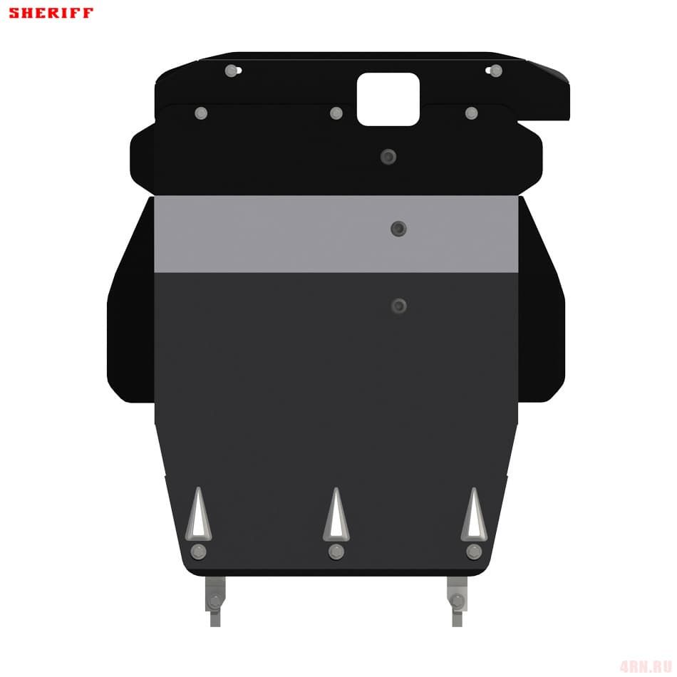 Защита картера Sheriff нужна для сохранности узлов и агрегатов, находящихся на днище авто. Она надежно защитит двигательный отсек вашей машины от повреждений. Также она защищает моторный отсек от влаги, грязи, и предусматривает наличие металлических крыльев, которые выполняют функцию пыльника.