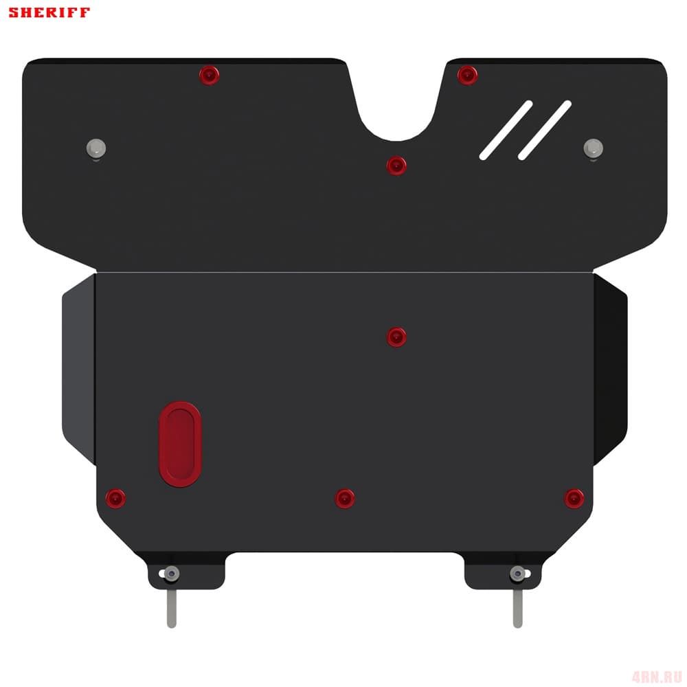 Защита картера Sheriff нужна для сохранности узлов и агрегатов, находящихся на днище авто. Она надежно защитит двигательный отсек вашей машины от повреждений. Также она защищает моторный отсек от влаги, грязи, и предусматривает наличие металлических крыльев, которые выполняют функцию пыльника.