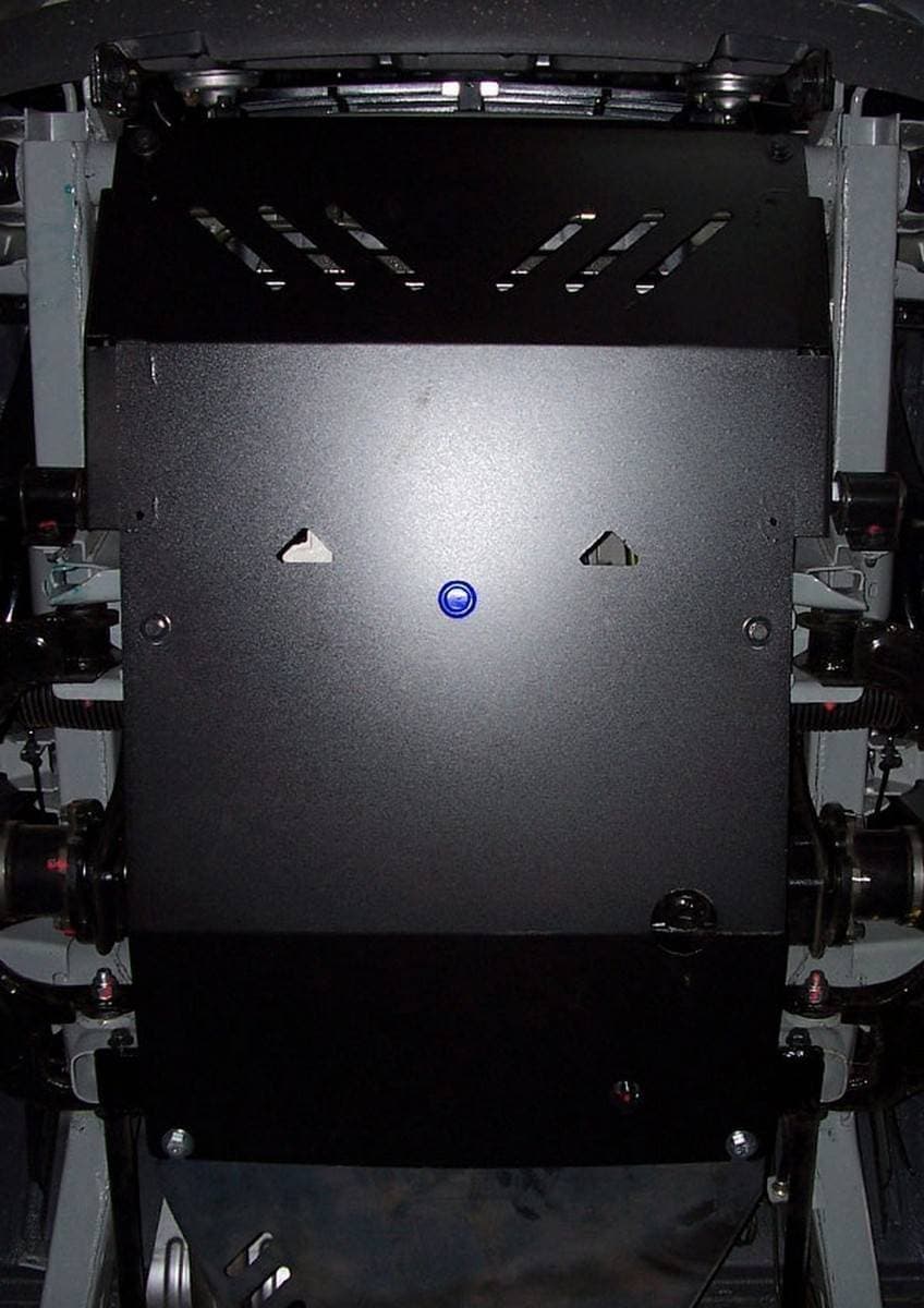 Порошковое окрашивание гарантирует долгий срок службы. А глубокий штамп увеличивает жесткость до 2,5 раз. Также имеется утопленный крепеж для предотвращения срывов. Качественная покраска защиты картера выдерживает 720 часов соляного тумана. Толщина изделия составляет 2-6 мм. Подштамповка в местах крепления предохраняет крепеж от срезания. Деталь спроектирована индивидуально для вашего автомобиля, что позволяет устанавливать ее в штатные места без доработки кузова за 10 мин.