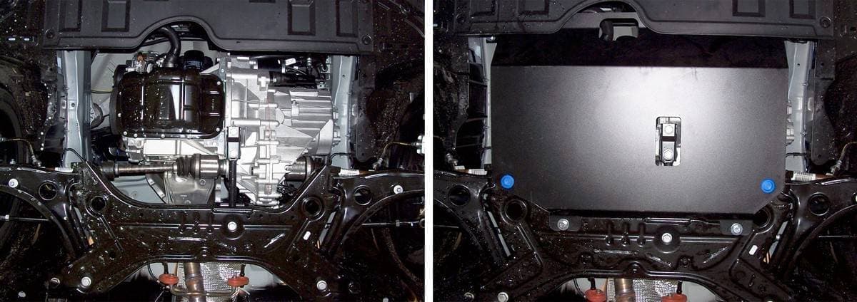 Порошковое окрашивание гарантирует долгий срок службы. А глубокий штамп увеличивает жесткость до 2,5 раз. Также имеется утопленный крепеж для предотвращения срывов. Качественная покраска защиты картера выдерживает 720 часов соляного тумана. Толщина изделия составляет 2-6 мм. Подштамповка в местах крепления предохраняет крепеж от срезания. Деталь спроектирована индивидуально для вашего автомобиля, что позволяет устанавливать ее в штатные места без доработки кузова за 10 мин.
