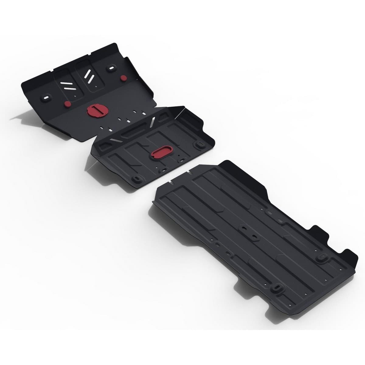 Порошковое окрашивание гарантирует долгий срок службы. А глубокий штамп увеличивает жесткость до 2,5 раз. Также имеется утопленный крепеж для предотвращения срывов. Качественная покраска защиты картера выдерживает 720 часов соляного тумана. Толщина изделия составляет 2-6 мм. Подштамповка в местах крепления предохраняет крепеж от срезания. Деталь спроектирована индивидуально для вашего автомобиля, что позволяет устанавливать ее в штатные места без доработки кузова за 10 мин.