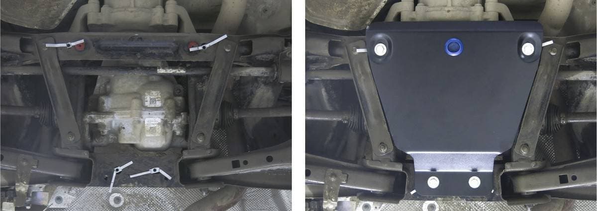 Порошковое окрашивание гарантирует долгий срок службы. А глубокий штамп увеличивает жесткость до 2,5 раз. Также имеется утопленный крепеж для предотвращения срывов. Качественная покраска защиты картера выдерживает 720 часов соляного тумана. Толщина изделия составляет 2-6 мм. Подштамповка в местах крепления предохраняет крепеж от срезания. Деталь спроектирована индивидуально для вашего автомобиля, что позволяет устанавливать ее в штатные места без доработки кузова за 10 мин.