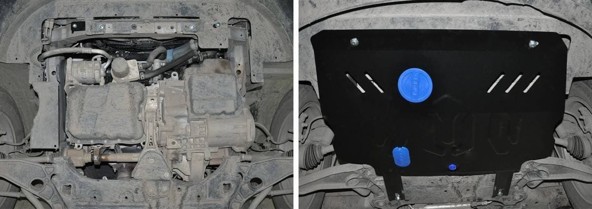 Порошковое окрашивание гарантирует долгий срок службы. А глубокий штамп увеличивает жесткость до 2,5 раз. Также имеется утопленный крепеж для предотвращения срывов. Качественная покраска защиты картера выдерживает 720 часов соляного тумана. Толщина изделия составляет 2-6 мм. Подштамповка в местах крепления предохраняет крепеж от срезания. Деталь спроектирована индивидуально для вашего автомобиля, что позволяет устанавливать ее в штатные места без доработки кузова за 10 мин.