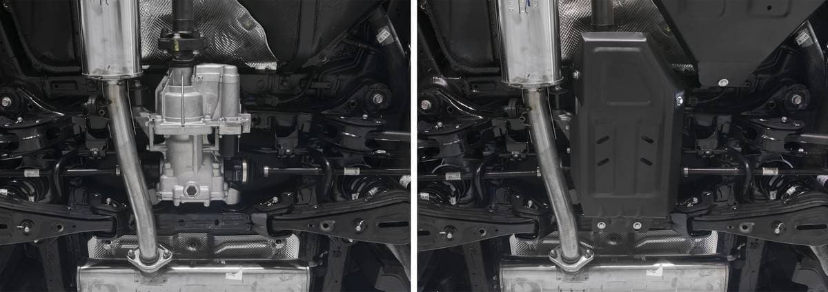 Порошковое окрашивание гарантирует долгий срок службы. А глубокий штамп увеличивает жесткость до 2,5 раз. Также имеется утопленный крепеж для предотвращения срывов. Качественная покраска защиты картера выдерживает 720 часов соляного тумана. Толщина изделия составляет 2-6 мм. Подштамповка в местах крепления предохраняет крепеж от срезания. Деталь спроектирована индивидуально для вашего автомобиля, что позволяет устанавливать ее в штатные места без доработки кузова за 10 мин.