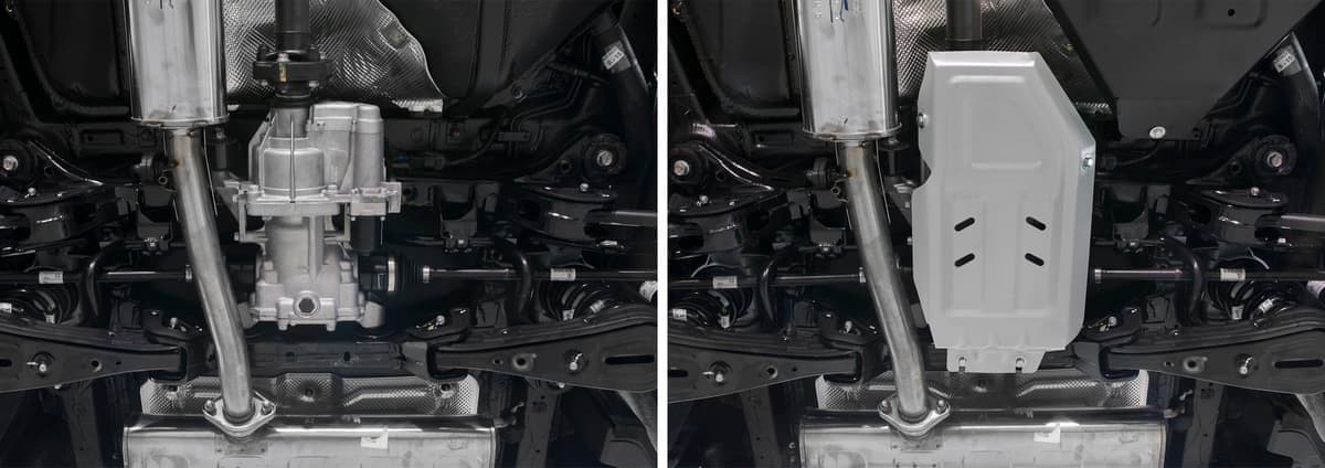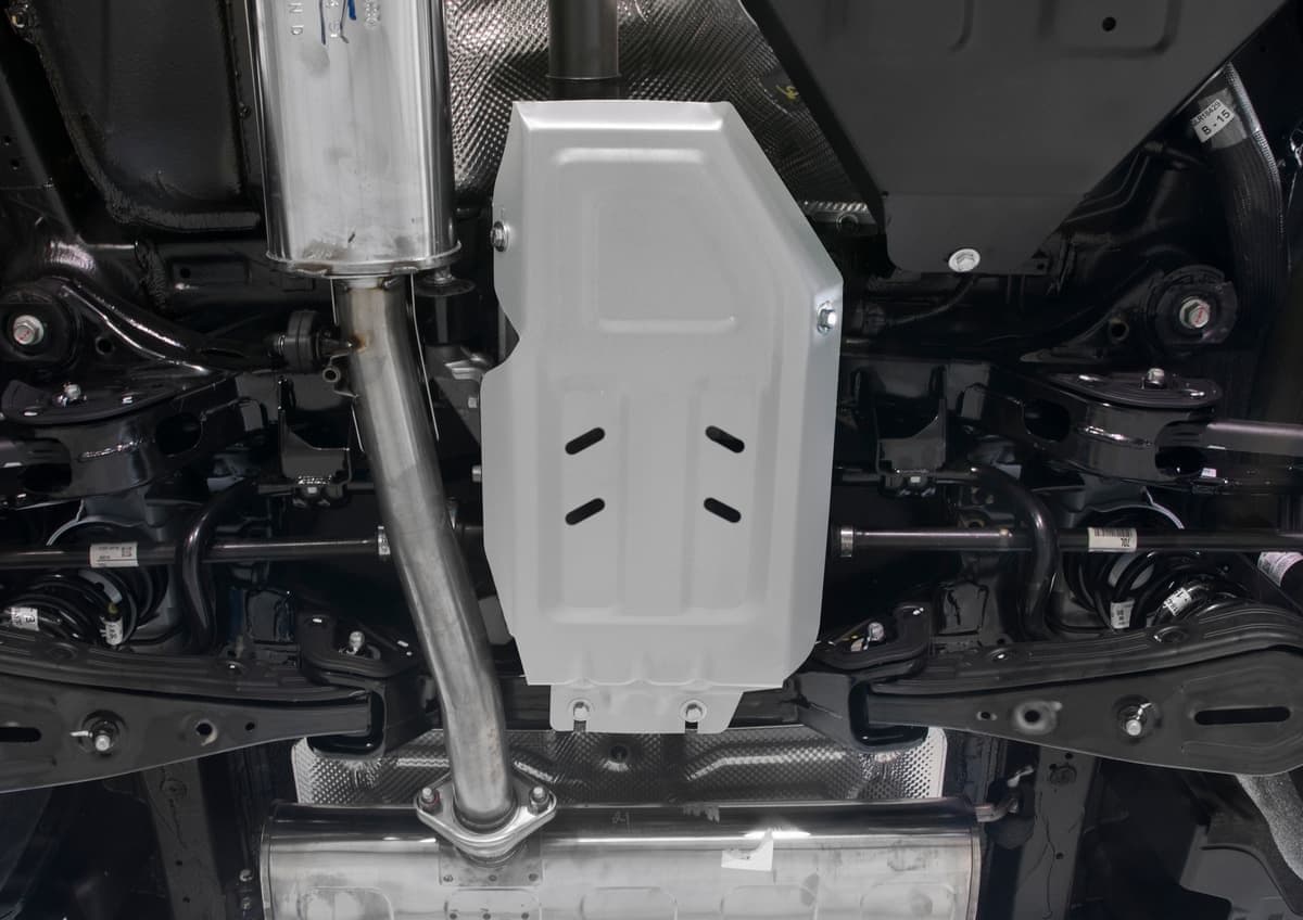 Стойкое порошковое окрашивание позволяет сохранить внешний вид, защитит от царапин, предотвратит коррозию. Также имеется утопленный крепеж для предотвращения срывов. Крепеж не образует с алюминием гальваническую пару. Защита спроектирована индивидуально для автомобиля, что позволяет устанавливать ее в штатные места без доработки кузова за 10 мин.