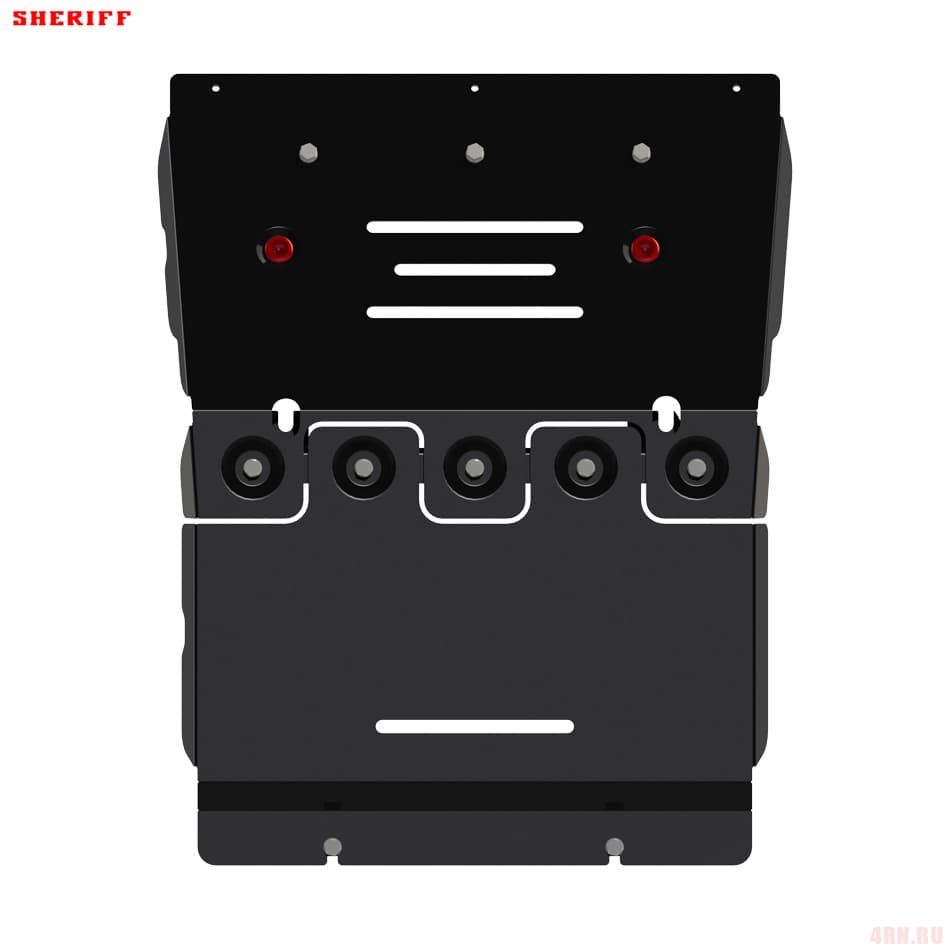 Защита картера Sheriff нужна для сохранности узлов и агрегатов, находящихся на днище авто. Она надежно защитит двигательный отсек вашей машины от повреждений. Также она защищает моторный отсек от влаги, грязи, и предусматривает наличие металлических крыльев, которые выполняют функцию пыльника.